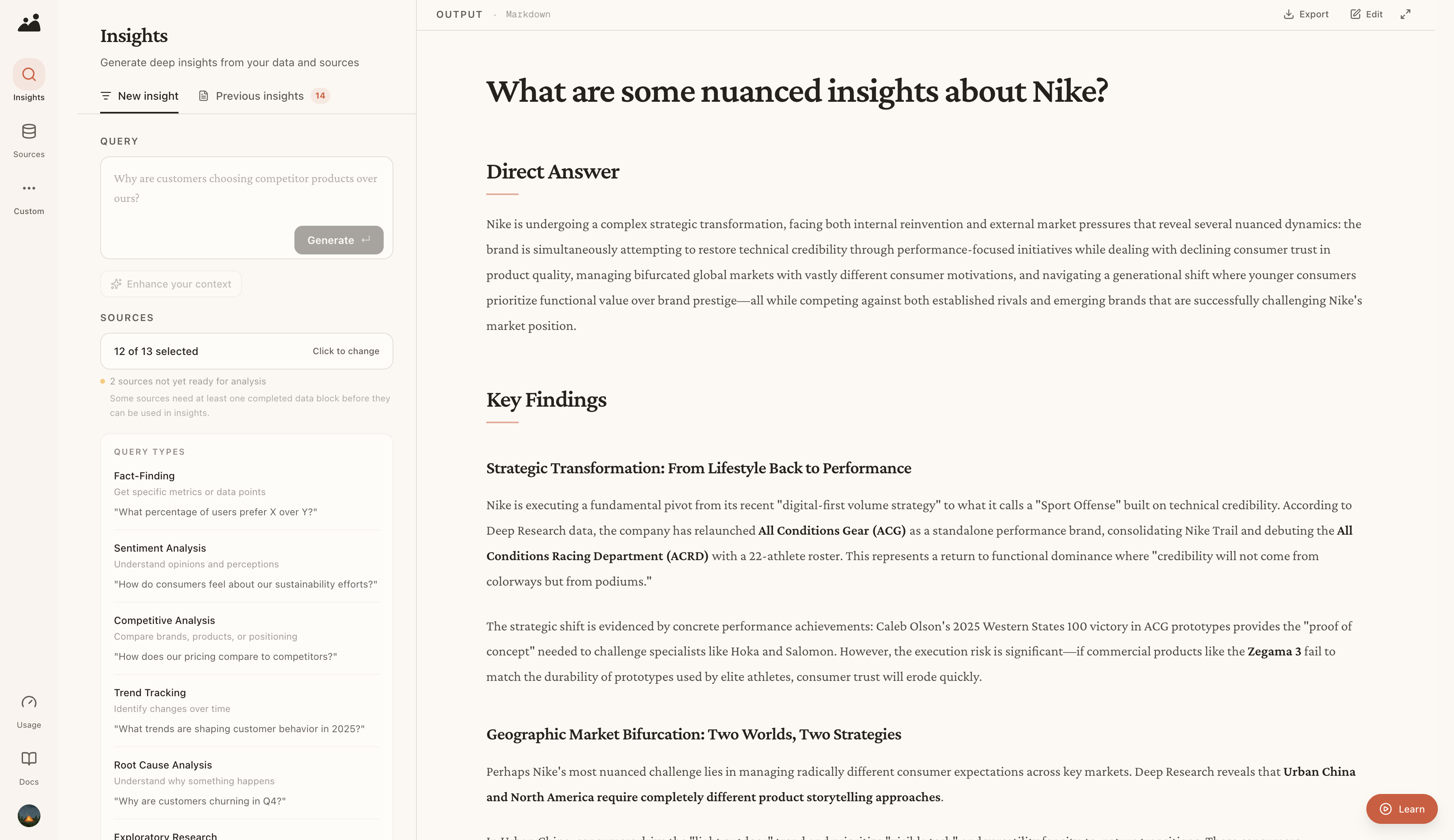 The fastest path to making your agency AI-native. One platform, flat rate, unlimited AI-powered research. Your team runs faster, your margins improve, your clients get better work.